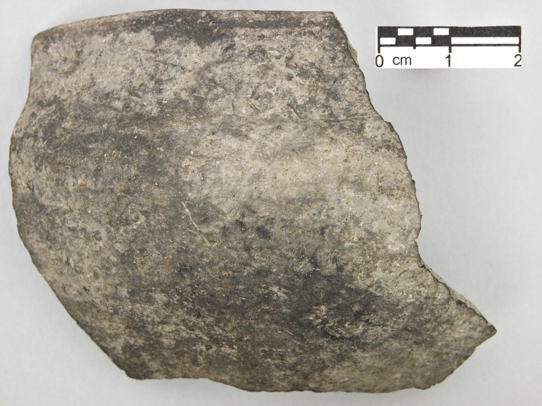 Frammento di scodella con orlo arrotondato e vasca profonda a profilo convesso, leggermente rientrante all'imboccatura; superfici grigie, lisciate.