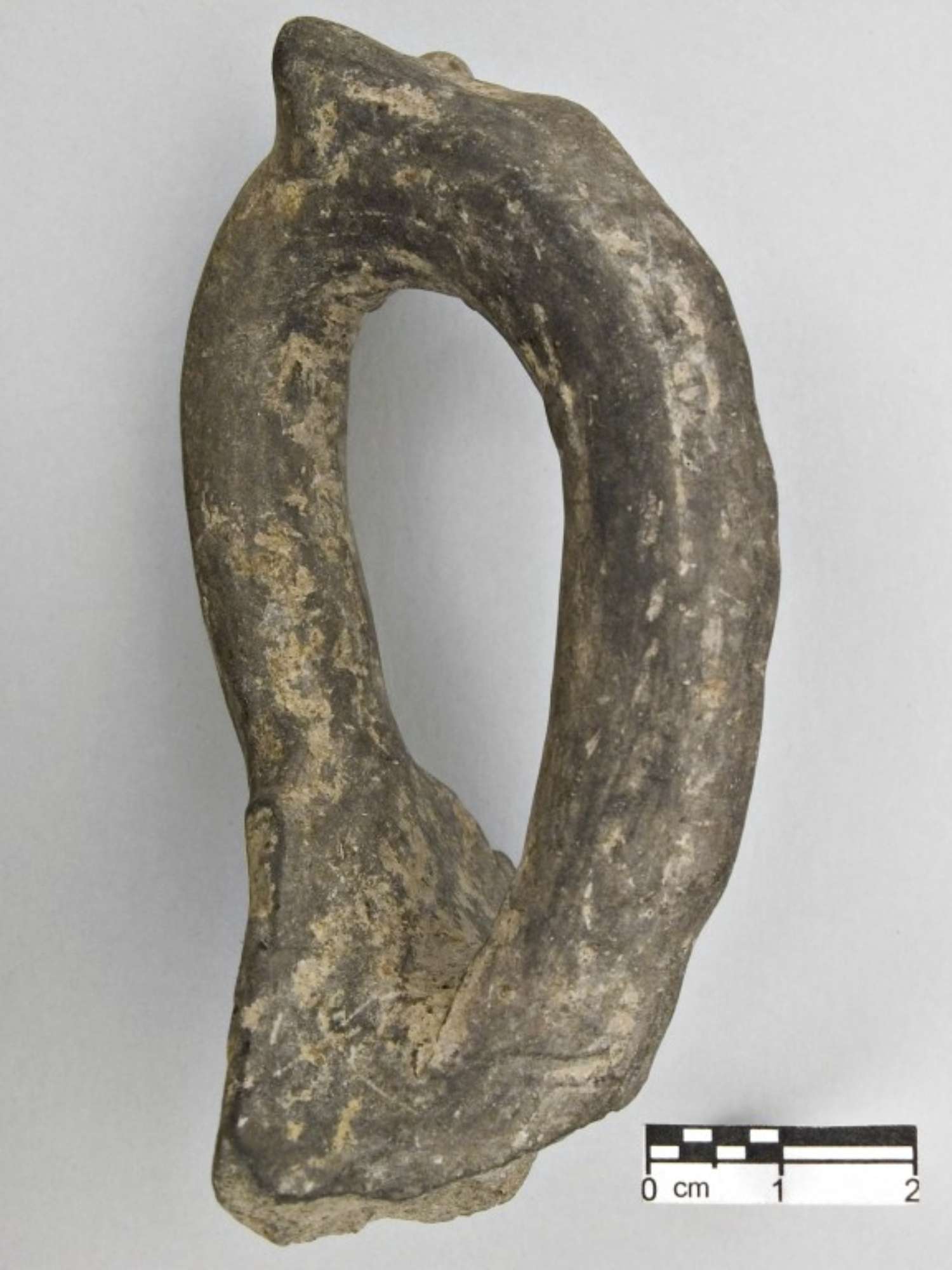 Ansa ad anello verticale sopraelevato con sezione a bastoncello, con coppia di cornetti conici disposti obliquamente sulla sommità; superfici grigio-nerastre, lisciate.