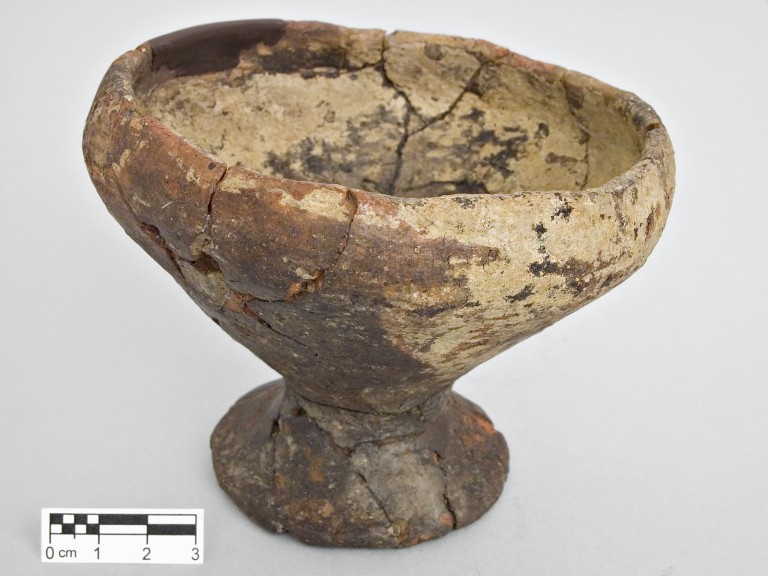 Coppa su basso piede cavo, labbro rientrante, vasca troncoconica, due forellini sotto il labbro per la sospensione.