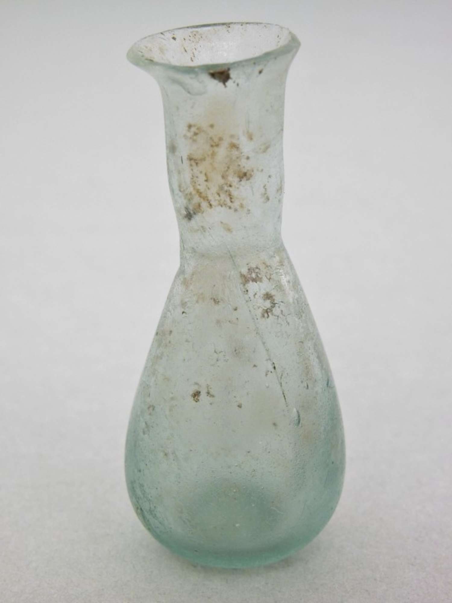 Balsamario in vetro di tipo Isings 6/28a, di forma asimmetrica, con labbro svasato e orlo tagliato, breve collo cilindrico strozzato alla base, ventre piriforme, fondo piano. Vetro comune verde-azzurro trasparente, soffiato.