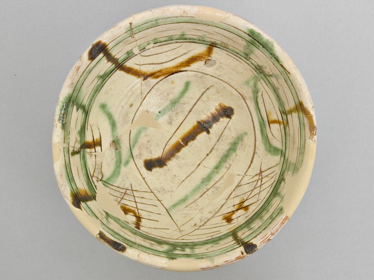 Ciotola a corpo emisferico e piede a disco leggermente concavo in ceramica "graffita rinascimentale". La decorazione è costituita da uno stemma ovoide stilizzato su sfondo a graticcio.