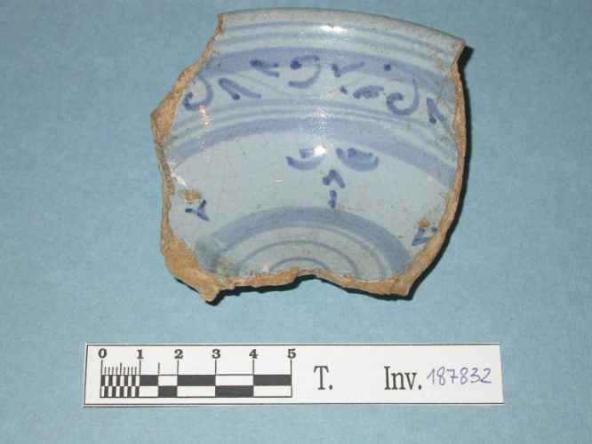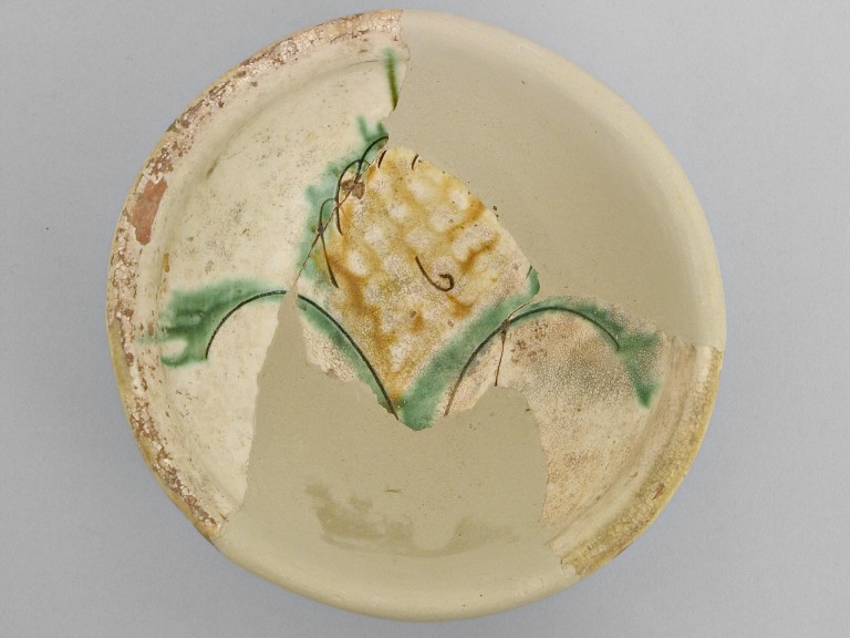 Ciotola emisferica con piede a ventosa in ceramica graffita policroma decorata da motivo vegetale polilobato centrale.