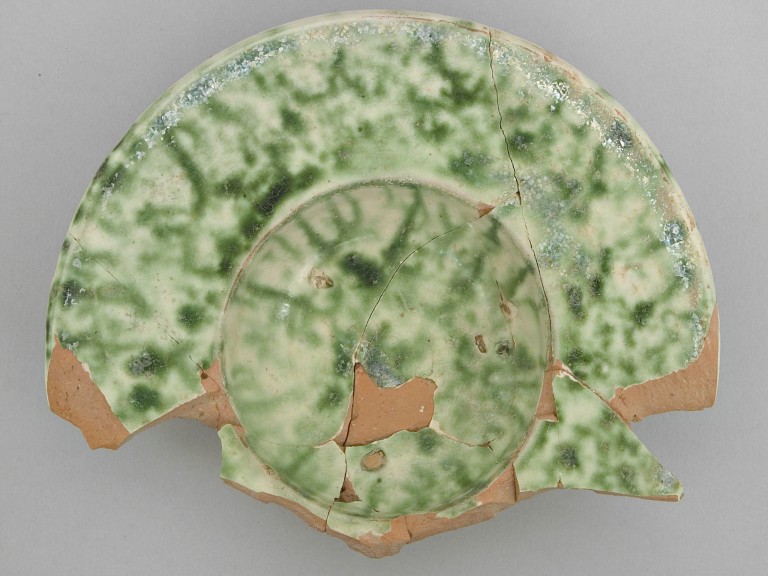 Ciotola apoda a tesa dipinta a maculazione verde.