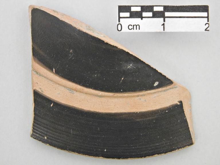 Frammento molto piccolo di piede a tromba di kylix in ceramica attica; la parte conservata mantiene la dipintura a vernice nera, superiormente, con una fascia risparmiata in corrispondenza della risega; fondo esterno a risparmio, eccetto una fascia sul bordo ed una linea concentrica.