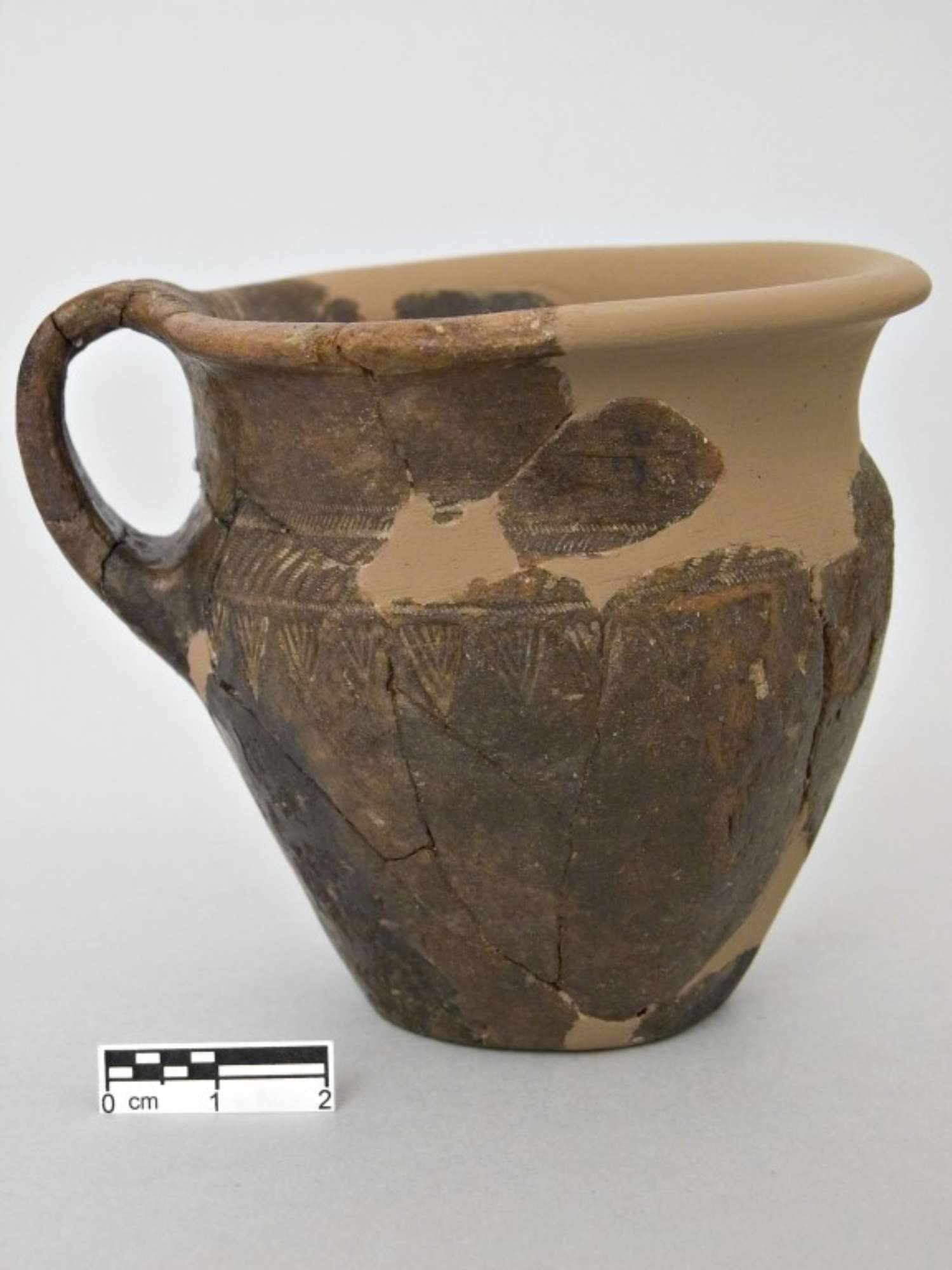 Boccale monoansato, con labbro estroverso, spalla breve, corpo troncoconico, fondo piano, ansa a nastro dalla spalla all'orlo; decorato sulla spalla a falsa cordicella con una fascia campita a linee oblique parallele tra fasce orizzontali; al di sotto sono denti di lupo a incisione; ansa decorata con due fasce longitudinali, parallele, a falsa cordicella.