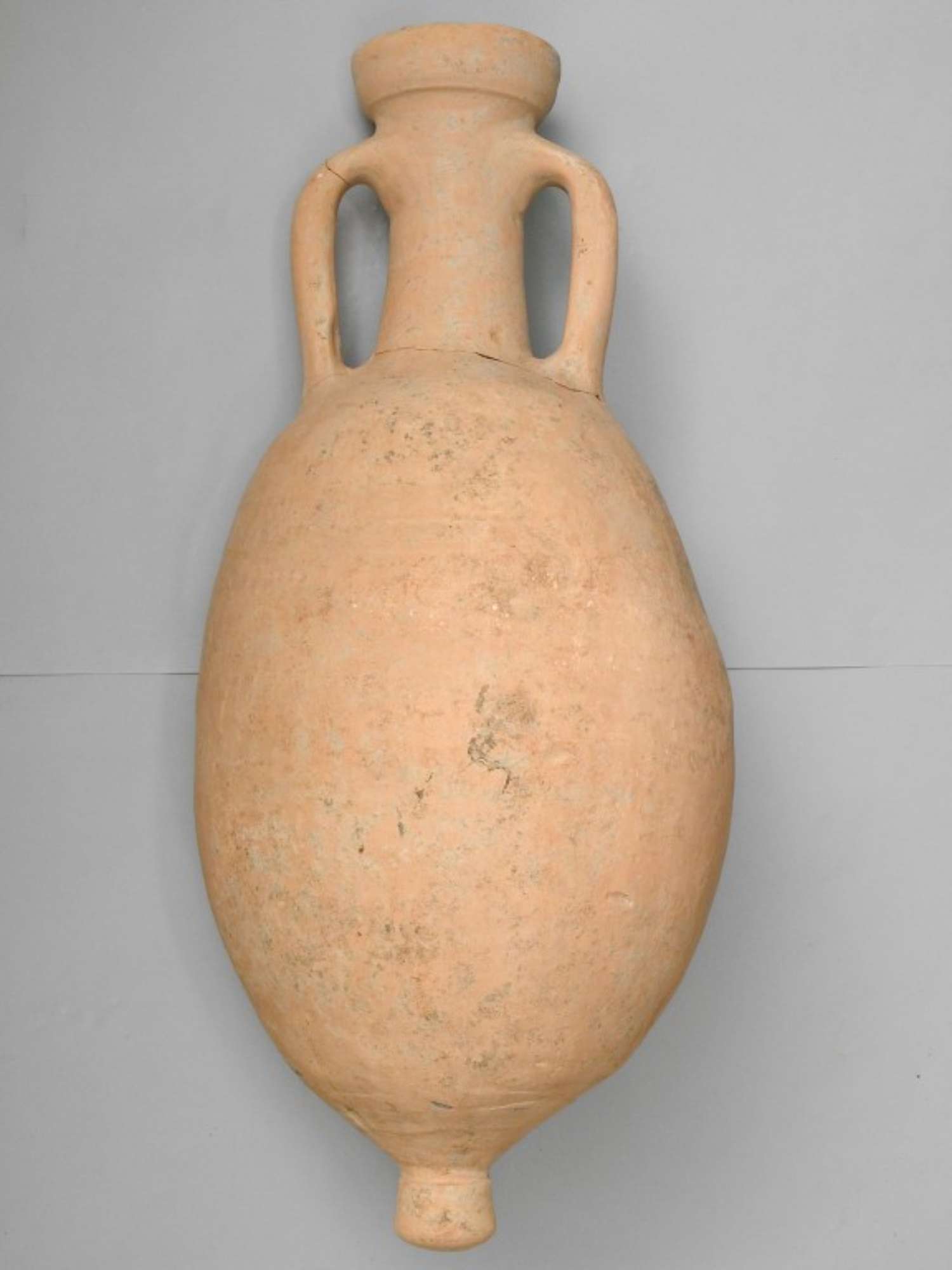 Anfora di tipo Dressel 6A, con alto orlo a fascia rilevata, collo cilindrico, anse a bastoncello flesse senza gomito, spalla poco accentuata, pancia piriforme, corto puntale pieno a bottone.