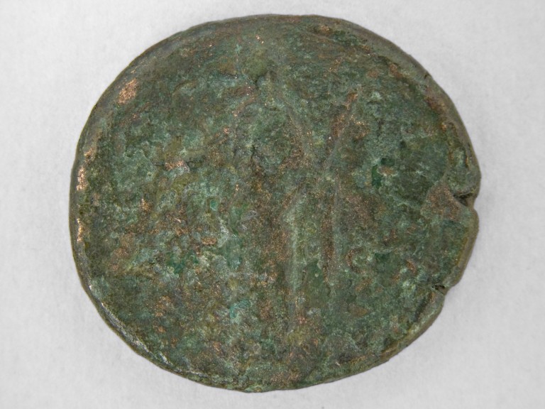 Moneta in bronzo; dupondio o asse di Lucilla, figlia di Marco Aurelio. Sul diritto: testa di Lucilla a destra. Sul rovescio: Vesta velata e drappeggiata stante frontale, testa a sinistra, tiene un simpulum nella destra protesa, altare alla sua sinistra.