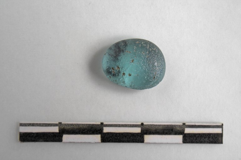 Pedina in pasta vitrea azzurrognola di forma ellittica.