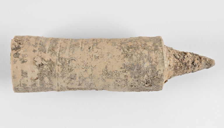 Tubulo cilindrico, internamente cavo, corpo costolato con superficie esterna segnata da striature che miglioravano l'aderenza della malta; a una delle estremità presentava originariamente una terminazione ad appendice sottile rastremata, con punta arrotondata, qui non conservata.
