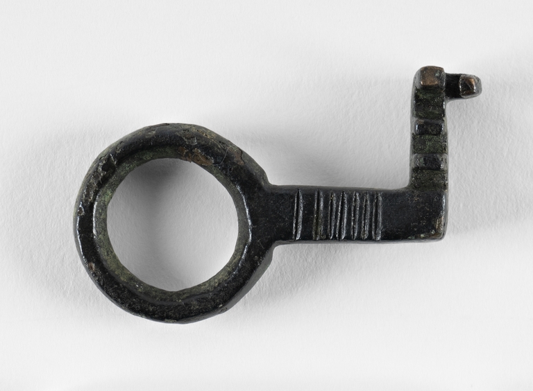 Chiave in bronzo del tipo a scorrimento, con impugnatura ad anello circolare a sezione rettangolare, stelo a sezione rettangolare decorato da solchi trasversali incisi, ingegno a quattro denti di cui no ortogonale agli altri.