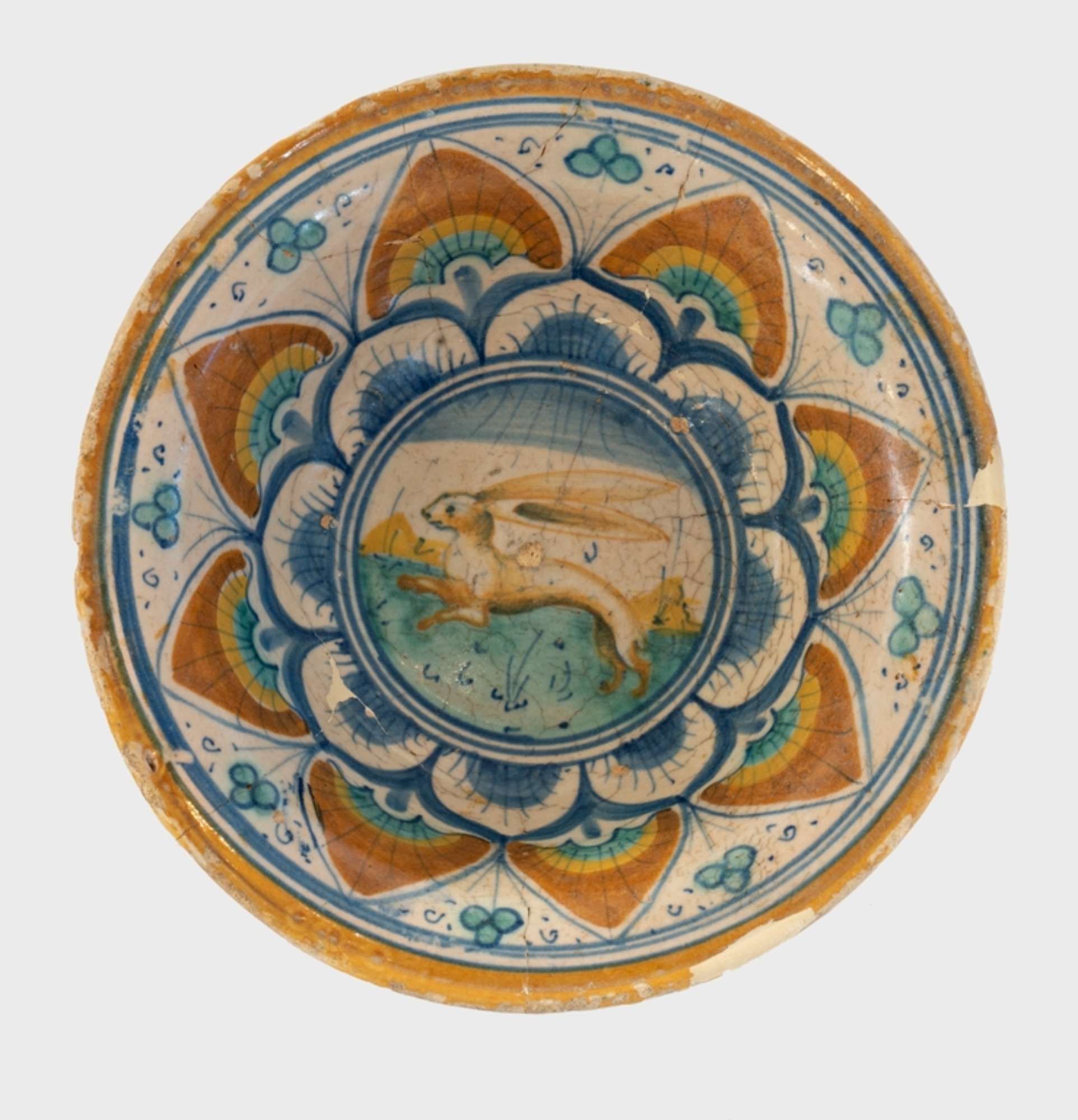 Al centro, nel recto, entro clipeo, paesaggio fantastico con lepre; le pareti recano un motivo a embricature e penne di pavone stilizzate; sul verso campiture a filetti.