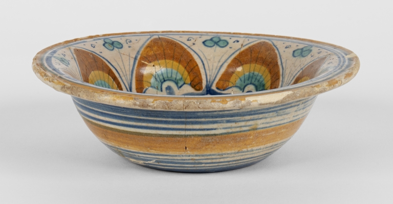 Ciotola svasata in maiolica policroma, corpo troncoconico, con breve tesa obliqua, orlo arrotondato ed evidenziato, apoda con fondo incavato e centro umbonato. La decorazione occupa sia l'interno che l'esterno. Maiolica policroma smaltata anche all'esterno; decoro nei colori bianco, blu, giallo aranciato.