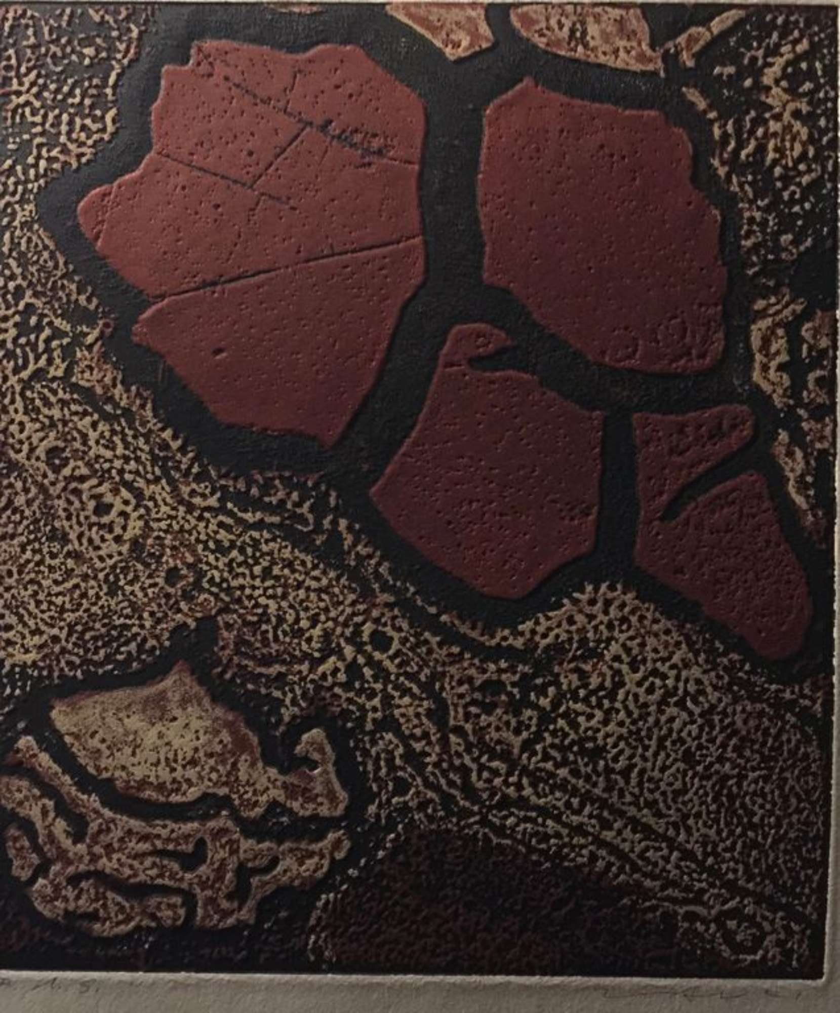 Serigrafia a rilievo policroma con soggetto informale materico.