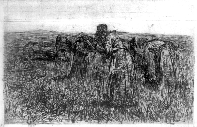 "L'acquaforte, datata 1900 (Grafica . 1975), presenta elementi compositivi desunti da due fotografie che Graziosi utilizzerà per comporre altre opere: è il caso, questo, della figura della contadina con la mano sul capo, in fondo a sinistra, che compare in un'altra stampa dal titolo omonimo (inv.F.G.s.022) e nel dipinto ""Afa"" di ubicazione ignota (Giuseppe Graziosi … 1994). Ad eccezione del cielo, forse lasciato intenzionalmente bianco, figure e paesaggio vengono tracciati con un segno rapido e graffiante, di uguale intensità che rende difficoltosa la percezione dei diversi piani."