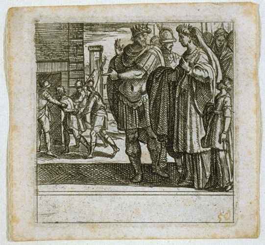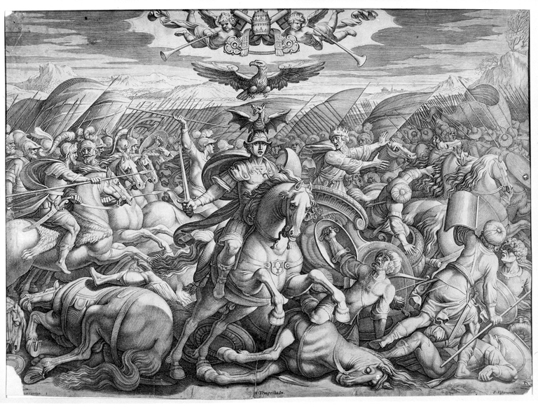 In alto il triregno sorretto da due putti in procinto di suonare le trombe e sotto un'aquila in volo che sta per appoggiarsi sul drago del cimiero del comandante. La figura del condottiero a cavallo con la spada sguainata è circondata dai soldati protesi all'inseguimento delle truppe persiane.