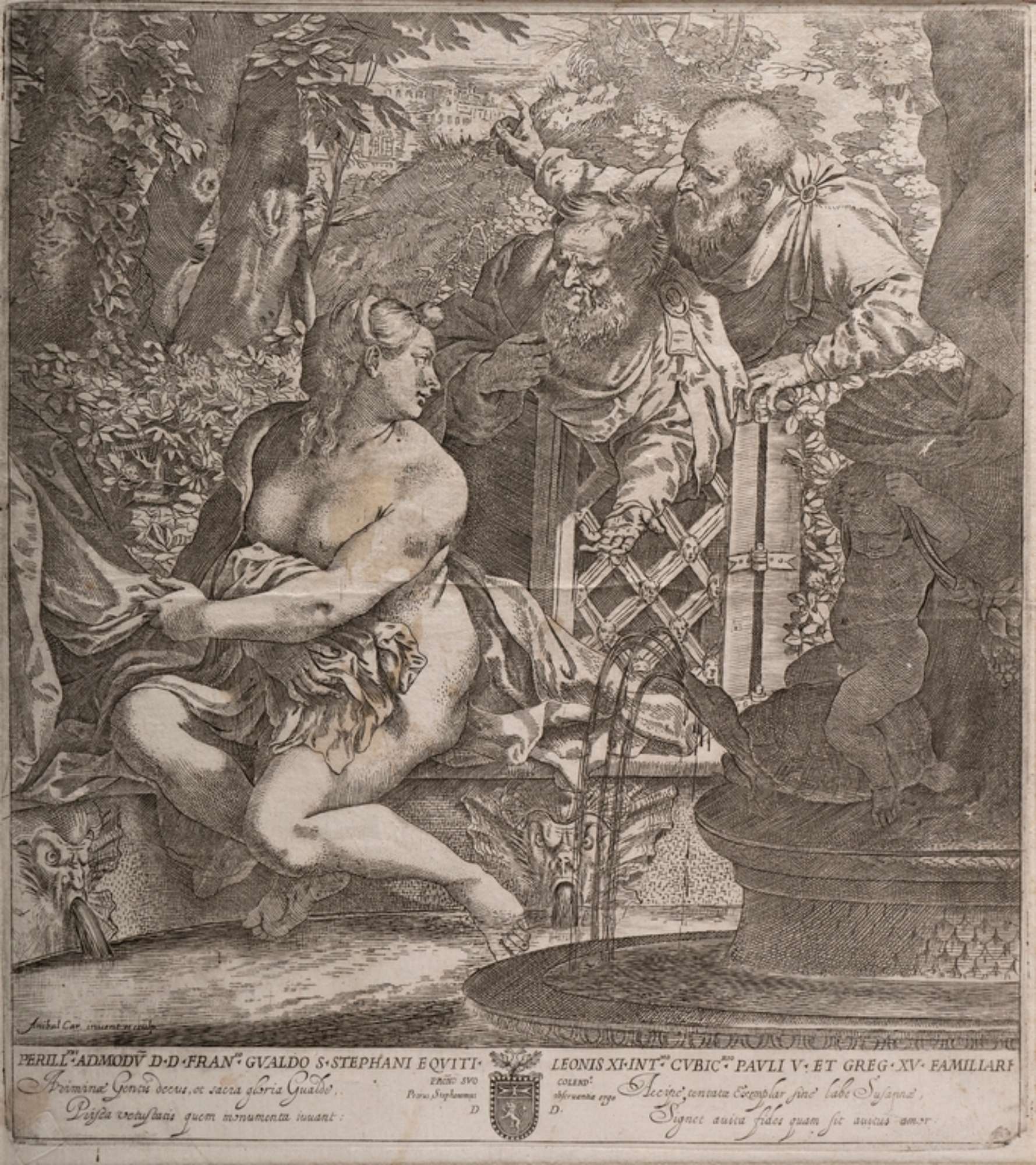 In un giardino, a destra in primo piano c'è una fontana, dietro a sinistra uno donna seminuda che rivolge lo sguardo verso i due vecchi a destra; in lontananza, oltre il giardino, un palazzo.