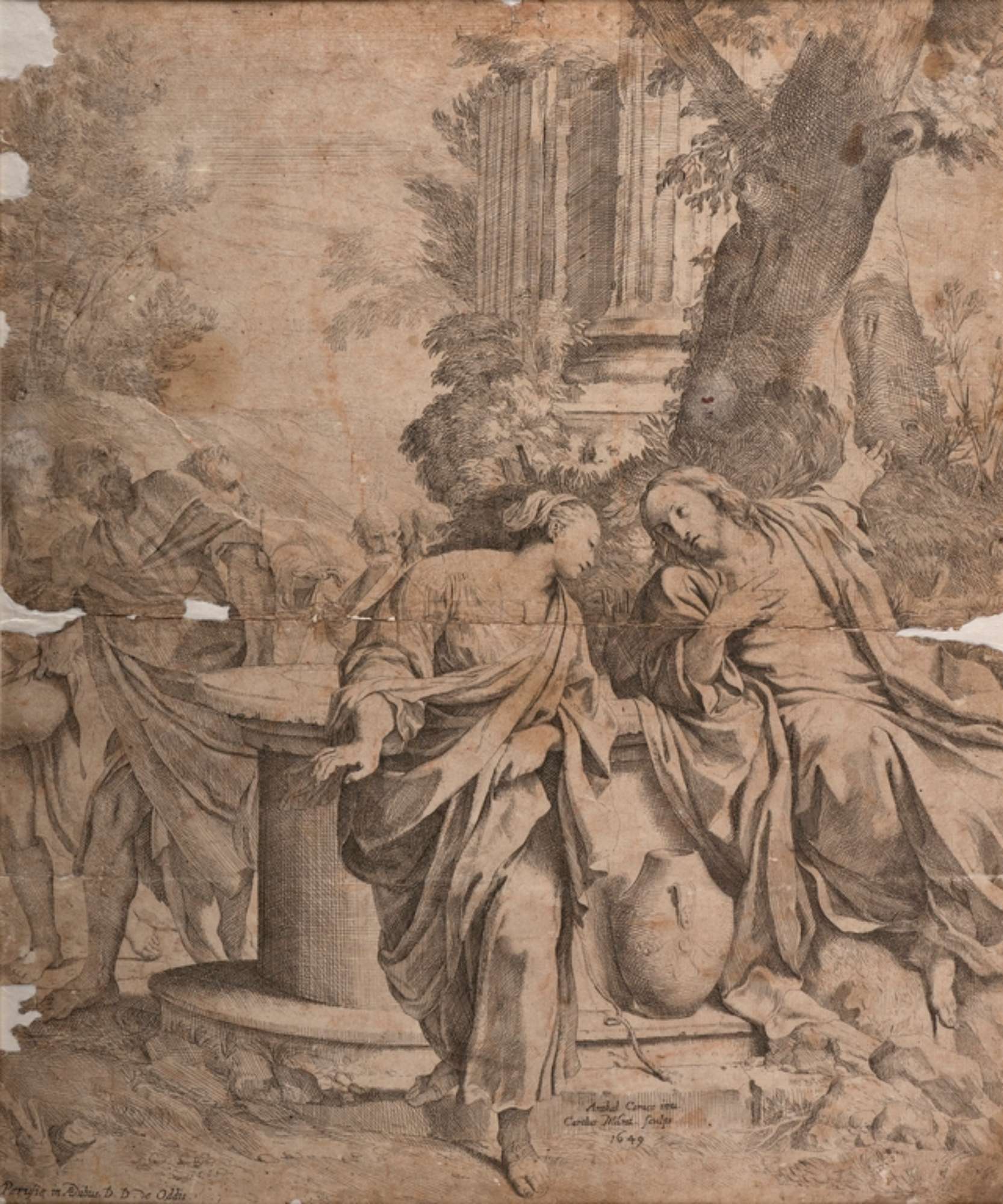 Cristo, appoggiato al bordo di un pozzo, si rivolge a una donna, indicandole con la mano sinistra dietro di sé. Sullo sfondo, compaiono le colonne classiche di un tempio.