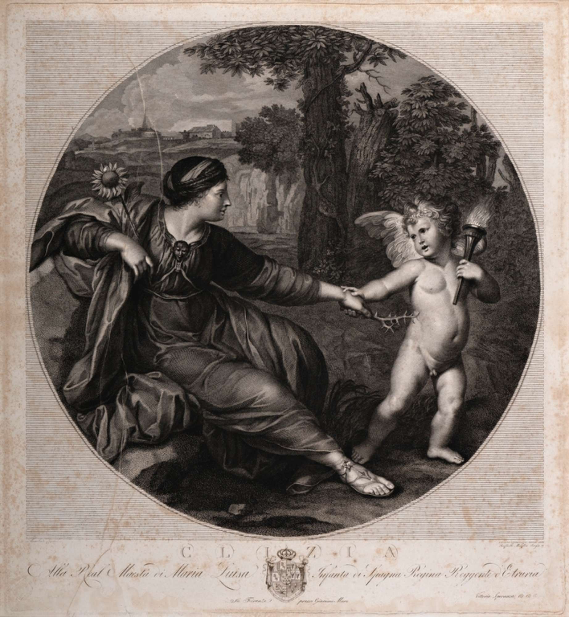 A sinistra una giovane donna abbigliata, sulla destra Cupido regge una fiaccola; sullo sfondo un paesaggio con degli edifici in fondo.