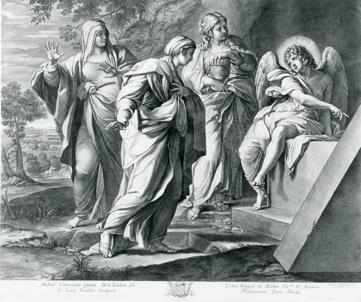 Vi sono nella detta stampa le tre Marie che si recano al sepolcro di Cristo, ma ad attenderle vi è un angelo che gli narra il fatto miracoloso, quindi la Resurrezione di Gesù.