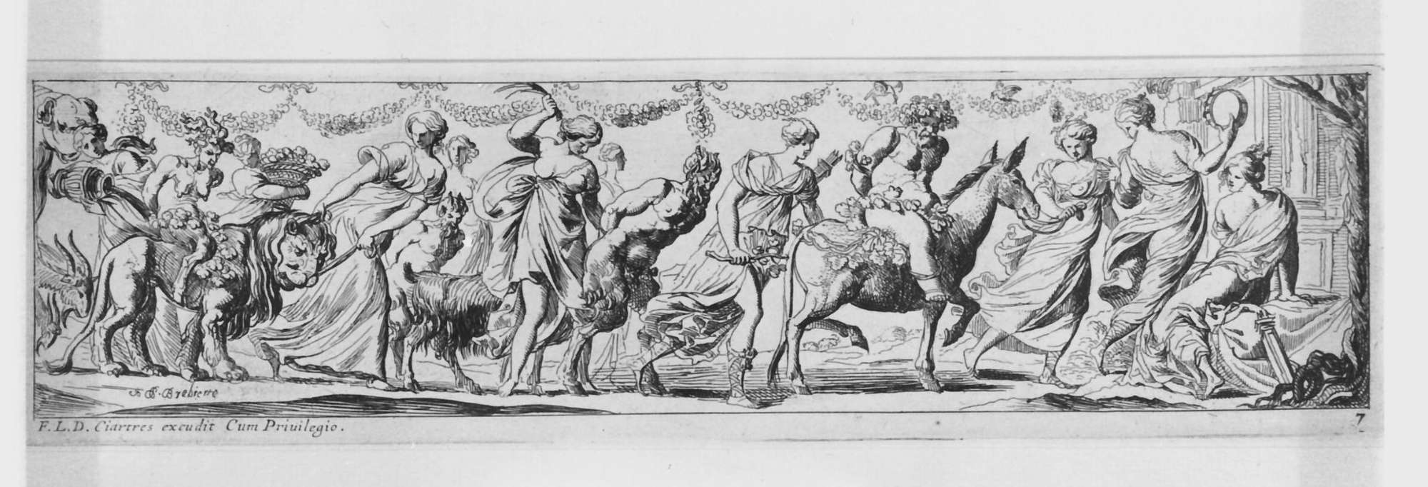 Corteo di ninfe e amazzoni trascinano satiri a piedi e in sella a un leone e a un asino.