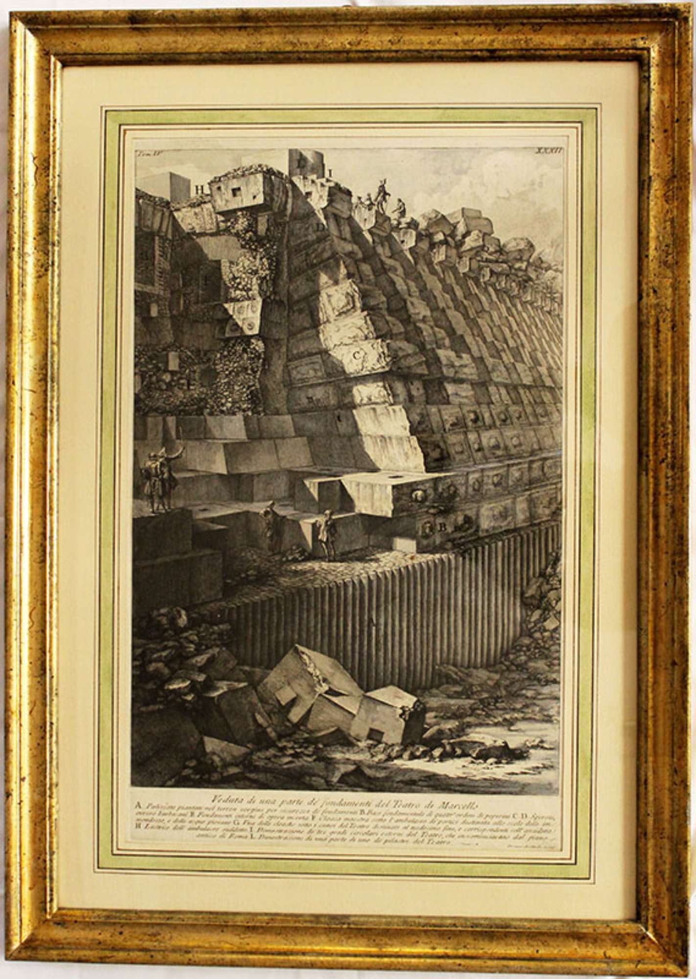 Incisione ad acquaforte con ritocchi a bulino raffigurante la veduta di una parte delle fondamenta del Teatro Marcello di Roma, con alcune figure in abiti settecenteschi. La stampa è incorniciata da un passpartout decorato a lavis, e conservata all'interno di una cornice di legno con filo dorato.