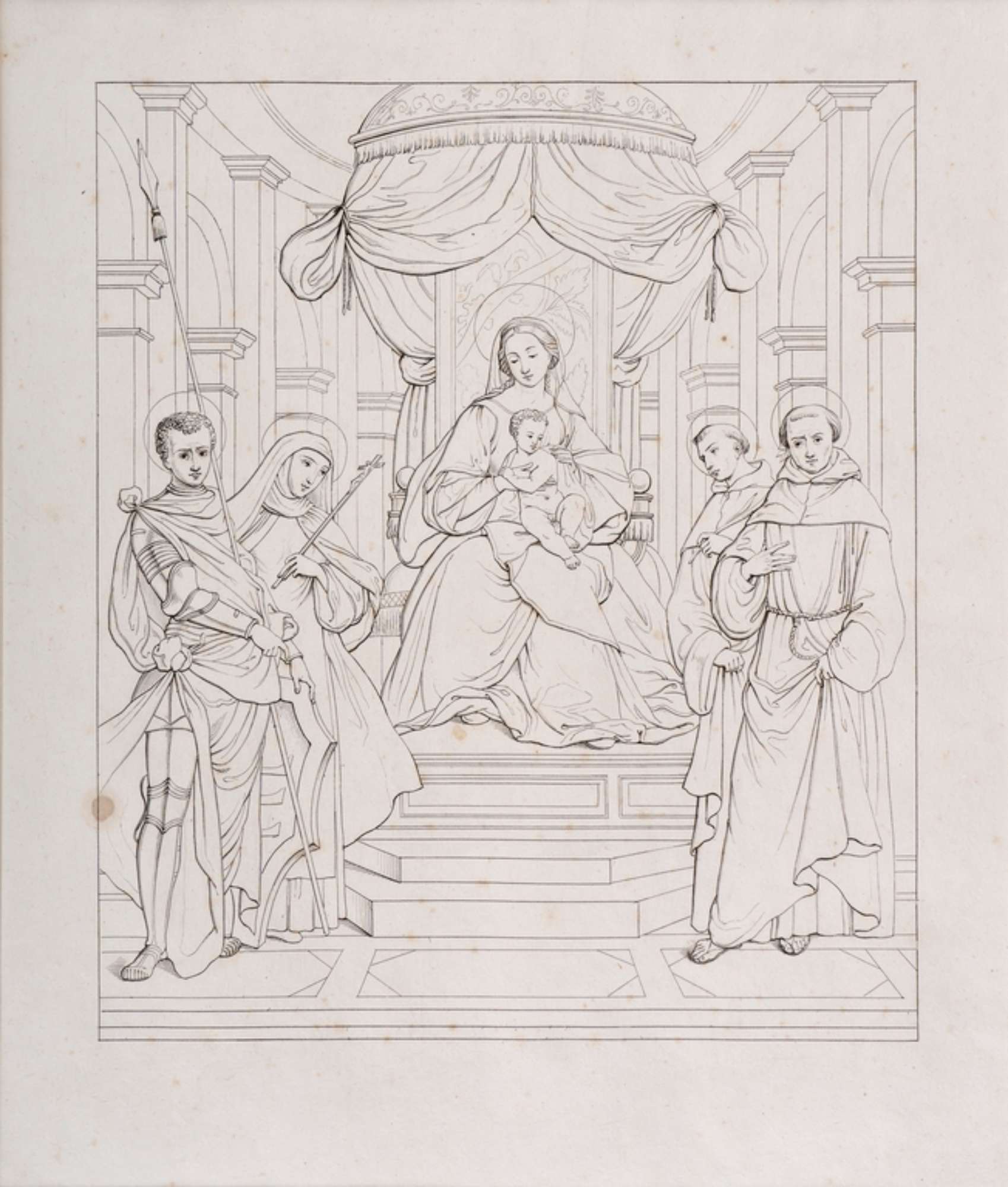 L’opera, seppure priva di firma, si attribuisce a Gaetano Domenichini grazie a un confronto bibliografico avvalorato da analogie tematiche, tecniche e stilistiche con altri fogli della collezione. Presso Palazzo Bonacossi, infatti, si conservano numerose stampe dello stesso autore dedicate alla riproduzione di opere realizzate in ambiente ferrarese e incise con la tecnica filiforme del bulino a contorno. La presente incisione riproduce nello stesso verso la pala d'altare realizzata dal Garofalo nel 1517 per la chiesa francescana di S. Guglielmo a Ferrara, oggi conservata alla National Gallery di Londra