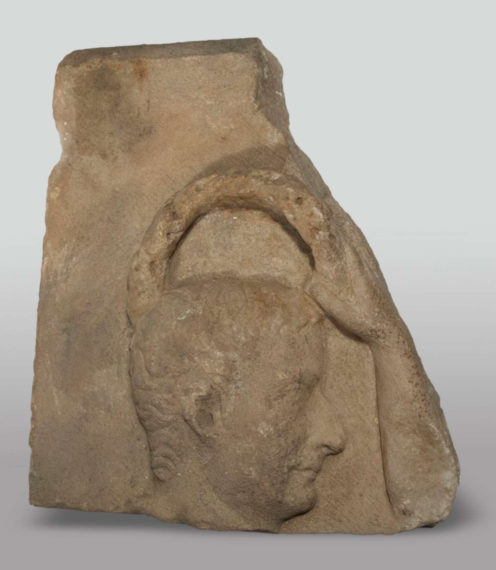 Del tutto eccezionale è, infine, il frammento di rilievo marmoreo – sicuramente pertinente a una lastra di rivestimento – che ritrae una figura maschile di profilo, di cui è conservata solo la testa in atto di essere laureata da un’altra figura (una Vittoria?) superstite solo nella mano e nell’avambraccio, di fattezze femminili. In via di ipotesi, trattarsi di un elemento relativo a un monumento funerario riconducibile alle architetture sepolcrali affermatisi in regione entro la prima metà del I sec. d.C., in cui non mancano richiami al ruolo pubblico o militare del defunto. Trattandosi di un recupero in superficie non v’è certezza assoluta della sua connessione con il contesto archeologico: non si può escludere infatti che il reperto sia stato, nel tempo, raccolto nei pressi e portato in loco per un qualche fine.