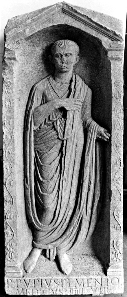 Sito romano di pod. Sant'Andrea: rilievo in marmo con figura maschile in atto di essere laureata
